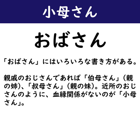 「おばさん」にはいろいろな書き方がある。親戚のおじさんであれば「伯母さん」(親の姉)、「叔母さん」(親の妹)。近所のおじさんのように、血縁関係がないのが「小母さん」。
