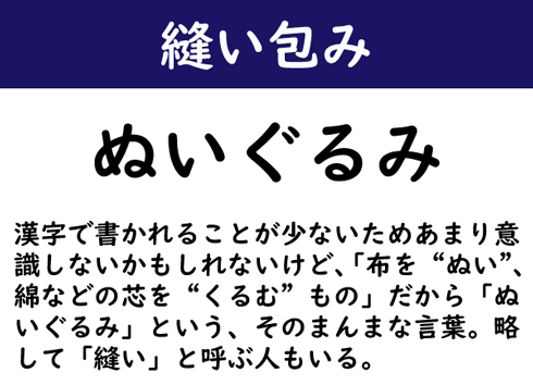 漢字で書かれることが少ないためあまり意識しないかもしれないけど、「布を“ぬい”、綿などの芯を“くるむ”もの」だから「ぬいぐるみ」という、そのまんまな言葉。略して「縫い」と呼ぶ人もいる。