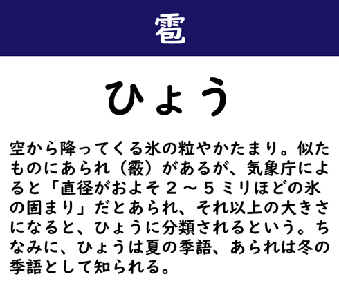 空から降ってくる氷の粒やかたまり。似たものにあられ(霰)があるが、気象庁によると「直径がおよそ2〜5ミリほどの氷の固まり」だとあられ、それ以上の大きさになると、ひょうに分類されるという。ちなみに、ひょうは夏の季語、あられは冬の季語として知られる。