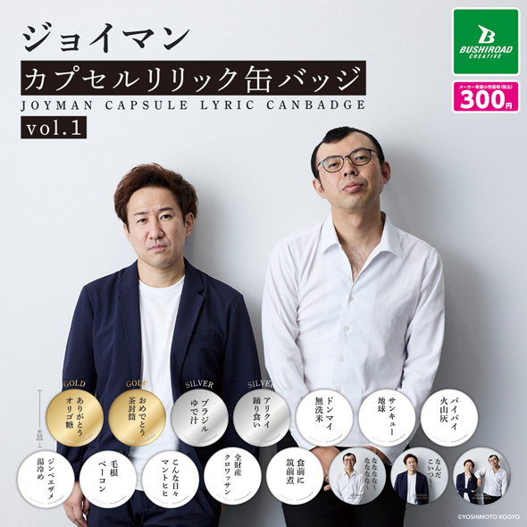 なんとこの缶、ブシロードクリエイティブから2023年3月に登場した「ジョイマン カプセルリリック缶バッジ」という公式グッズ。投稿された写真の缶をよく見ると、下部に「JOYMAN YOSHIMOTO KOGYO」と、権利元などが書かれています。