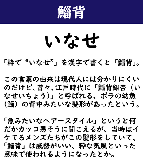「粋で“いなせ”」を漢字で書くと「鯔背」。この言葉の由来は現代人には分かりにくいのだけど、昔々、江戸時代に「鯔背銀杏(いなせいちょう)」と呼ばれる、ボラの幼魚(鯔)の背中みたいな髪形があったという。「魚みたいなヘアースタイル」というと何だかカッコ悪そうに聞こえるが、当時はイケてるメンズたちがこの髪形をしていて、「鯔背」は威勢がいい、粋な気風といった意味で使われるようになったとか。