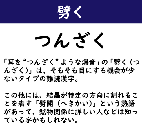 「耳を“つんざく”ような爆音」の「劈く(つんざく)」は、そもそも目にする機会が少ないタイプの難読漢字。この他には、結晶が特定の方向に割れることを表す「劈開(へきかい)」という熟語があって、鉱物関係に詳しい人などは知っている字かもしれない。