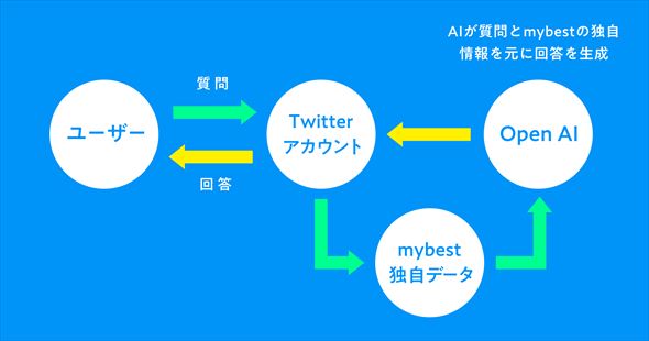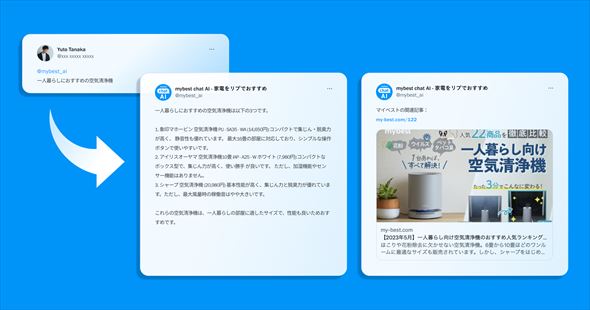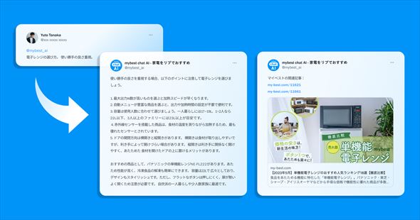 Twitterに、@mybest_ai へのメンションとともに条件をツイートするとAIが回答してくれるというもの。mybestの中でも検索上位の白物家電を対象に、同サービスの情報をもとに条件に合った家電をオススメしてくれるとのこと。家電にまつわる質問(例:人気商品を教えて、◯◯と△△の違いは?、◯◯の選び方を知りたい)にも回答できるとしています。