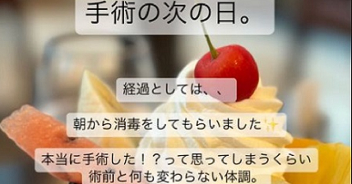 さらに、手術から2日経過した様子もシェアしており、「なーんともなく通常運転」「ジム、ホットヨガ、半身浴など血行がよくなるものは基本的に全て禁止です」「痛みももちろんなくて1週間後くらいから出血がはじまるみたいです。それがいつなのか、どんな感じなのかドキドキしています」と今後についても明かしました。