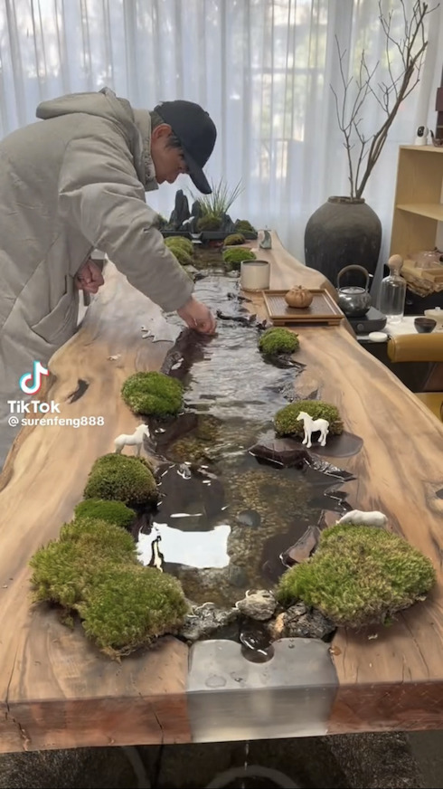 製作者は中国のデザイナー・Liketeatable(@surenfeng888)さん。庭園にある風流な池や小川のように、テーブルの中央を水が流れています。