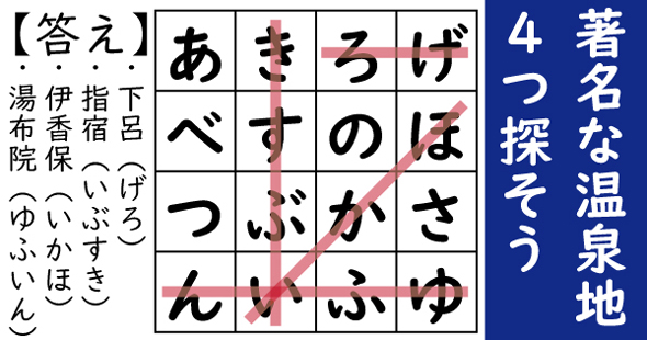 答え:下呂(げろ)、指宿(いぶすき)、伊香保(いかほ)、湯布院(ゆふいん)