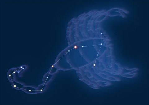 肉眼星数は62、T字型の頭部から、胸付近に輝くα星のアンタレス(Antares)を経て、天の川に浸った下半身は、ぐにゃりと曲がったサソリの長い尾が連なる、きわめて印象深い星座です。一等星であるα星の他、二等星が5つもあり、明るく非常にわかりやすい星座なのですが、惜しむらくは高度が低いことで、近年では夜遅くまで灯りが多く、高い建物などの遮蔽物も多い都市部では、この名星座を見ることがなかなか難しくなっています。