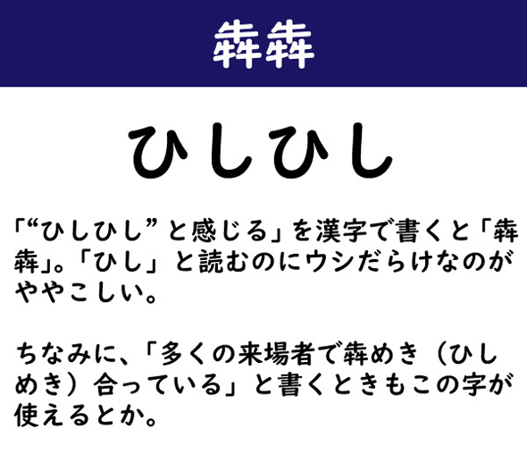 「“ひしひし”と感じる」を漢字で書くと「犇犇」。「ひし」と読むのにウシだらけなのがややこしい。ちなみに、「多くの来場者で犇めき(ひしめき)合っている」と書くときもこの字が使えるとか。