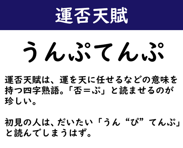 運否天賦は、運を天に任せるなどの意味を持つ四字熟語。「否=ぷ」と読ませるのが珍しい。初見の人は、だいたい「うん“ぴ”てんぷ」と読んでしまうはず。