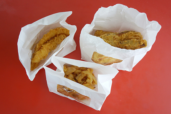 丸亀天ぷらといえば外せないのは、もちろん野菜かき揚げ。初めて食べた時は、そのおいしさと、リーズナブルな価格に反しての巨大さに驚いたもんだよなぁ……。というわけで、最後の1品はかき揚げ!