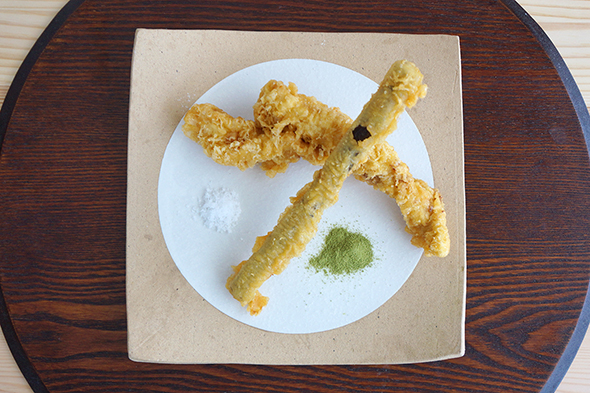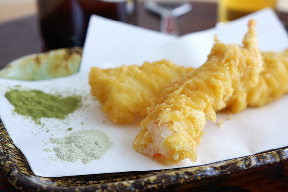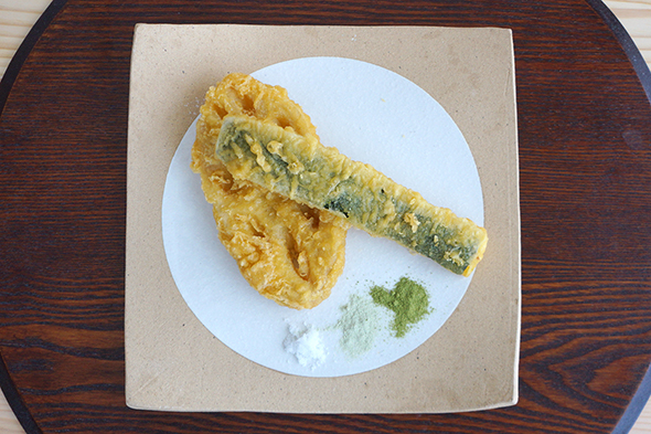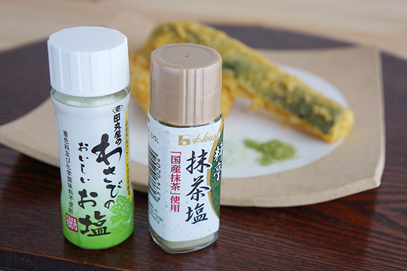 そしてお気付きでしょうか? そう、高級天ぷら店といえば、通の食べかたは「塩」。さらには「抹茶塩」や「わさび塩」(行ったことはないのであくまでイメージです)。というわけで、用意しましたよ。