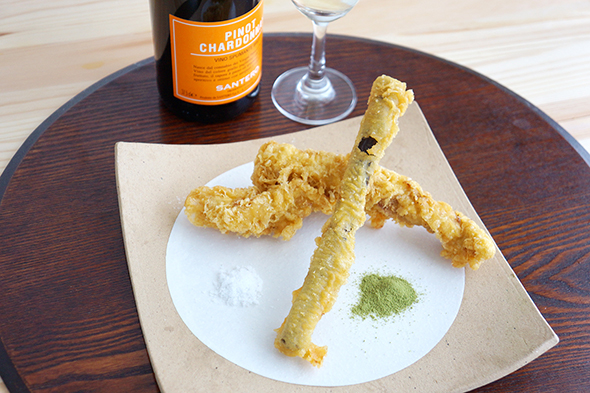 まずはズッキーニを塩で。お〜、甘くてジューシーで、いきなりめちゃくちゃうまいじゃないの。すかさずくいっとやるスパークリングワインが、想像以上に合う!