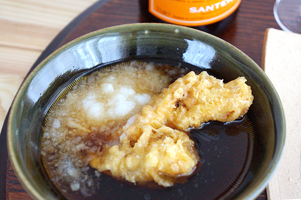 ただこのかしわ天、しっかりと味がついているので、塩や抹茶塩だとちょっと過剰に感じるかな。そこで、これまた用意しておいた、若干薄めの天つゆ&大根おろしに浸して食べると、これがばっちり!