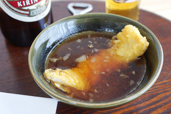 えび天&いか天&ビール。これはもう、勝利が約束されてるでしょう。実際、そのごちそう感で脳の快楽中枢をぶんなぐってくる海老も、味がたんぱくなのでどっぷりと天つゆに浸したいかも、これ以上ないくらいビールに合います。