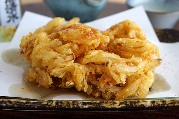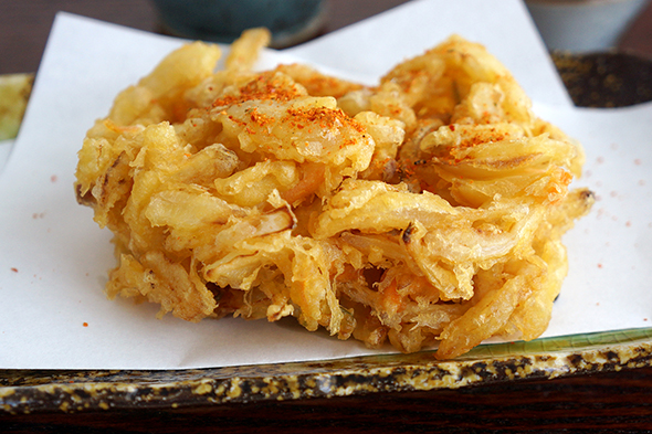 野菜かき揚げに七味をぱらりとふって