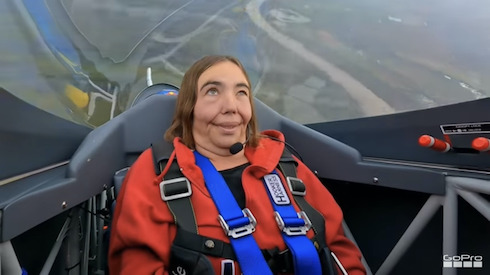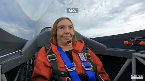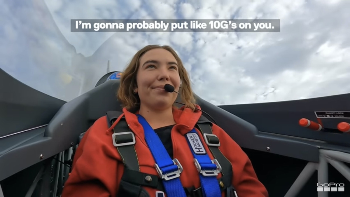 パイロットのEmma Bryanさんが飛行機に乗り込み、アクロバット飛行を披露する機内で9.5Gという猛烈な圧力を体験する様子が映されています。