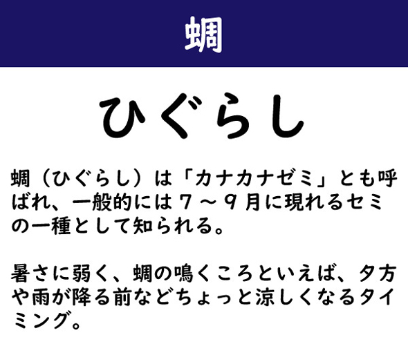 蜩(ひぐらし)は「カナカナゼミ」とも呼ばれ、一般的には7〜9月に現れるセミの一種として知られる。暑さに弱く、蜩の鳴くころといえば、夕方や雨が降る前などちょっと涼しくなるタイミング。