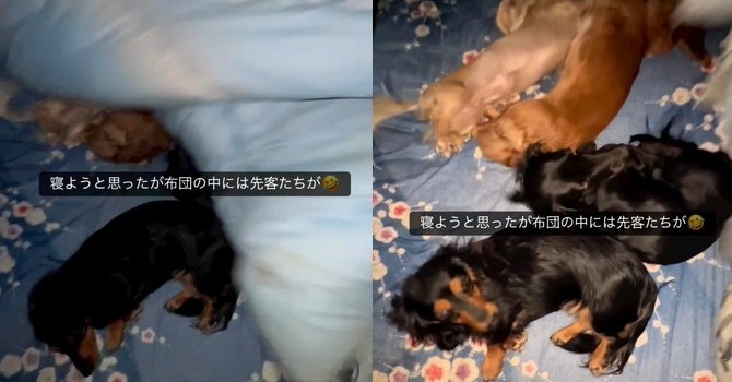 飼い主さんによると、布団をめくれば大体ワンコたちが先に寝ており、寝床の争奪戦が繰り広げられるのが日常になっているとのこと。さらに、ワンコたちと一緒に寝ると寝返りを打つことは出来ず、少し移動してもらったとしても、翌朝には飼い主さんが布団から追い出されているのだとか。