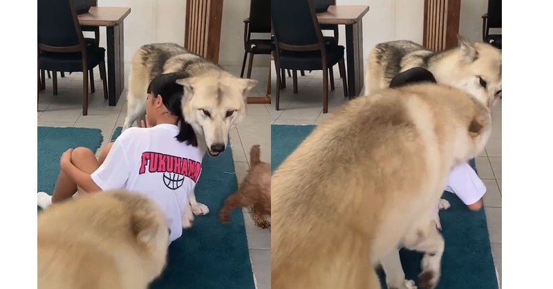 動画に登場するのは、ウルフドッグの姉「ナオ」ちゃんと、弟の「クン」くん。大好きな三女ちゃんが部活から帰宅すると、まずはナオちゃんがぴったりと寄り添います。そして後ろからクンくんもやってきました。