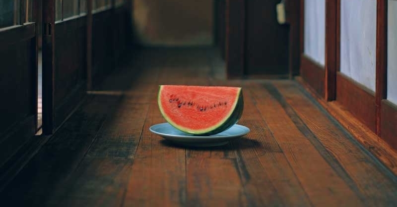 お皿にのったスイカを日本家屋の縁側で撮影したところ、たまたま空が曇ってしまったようで、暗くじめっとした雰囲気に。「日本の夏の風物詩」としてはある意味正解ですが、その和ホラー感に“涼”以上にヒヤリとするものを感じます。