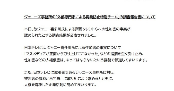 日本テレビは、「指摘を重く受け止め、性加害などの人権侵害は、あってはならないという姿勢で報道してまいります」と発表。人権を尊重した企業活動に努め、ジャニーズ事務所に対して「被害者の救済と再発防止に取り組むよう求める」としています。