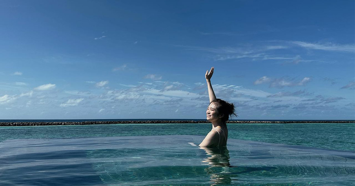 先の投稿でも「#ゼクシィ」「#モルディブ」というハッシュタグを添えて、青空の下でプールを楽しむ姿を披露。