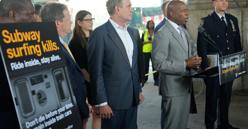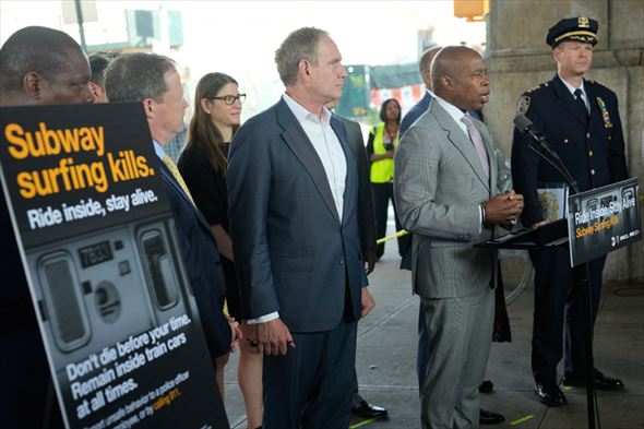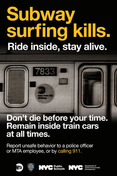 地下鉄の車両の上に乗る「地下鉄サーフィン」と呼ばれる危険行為を防止するべく、米ニューヨーク市長などが「地下鉄サーフィンは命を奪う。車内に乗って命を守ろう」キャンペーンを立ち上げました