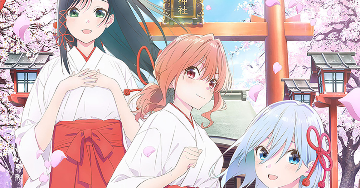 アニメの放送時期発表に併せて公開されたティーザービジュアルは、桜舞い散る甘神神社を背景に、ヒロインである甘神夜重、甘神夕奈、甘神朝姫の3人が巫女服姿でたたずむ姿が描かれています。