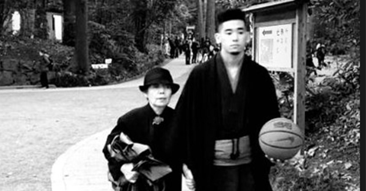 UTAさんは和服にスニーカー、空いた片手にはバスケットボールを持つというアバンギャルドな装いで、樹木さんはシックなコート&ハットを身に着けた洋装に。2ショットはモノクロで撮影されており、“ばあばと孫”のなんとも絵になる1枚になっています。