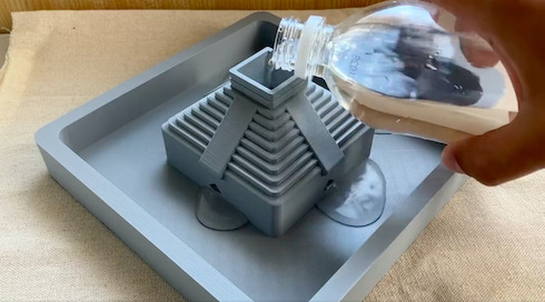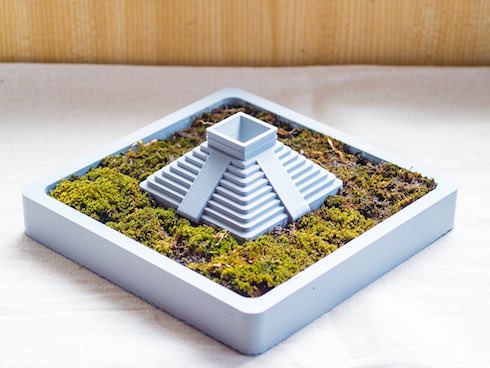 作者は、3Dプリンタを使ったDIY作品を発表している、けんけん(@XJ6xtyjOxoY2yJ9)さん。マヤ文明のピラミッドを模したオブジェがプランターの中央に建っていて、最上段から水を注げる仕掛けになっています。供物をささげるような感覚で水やりができる!