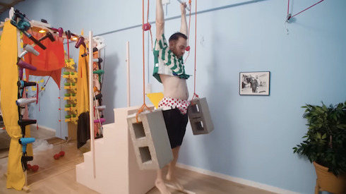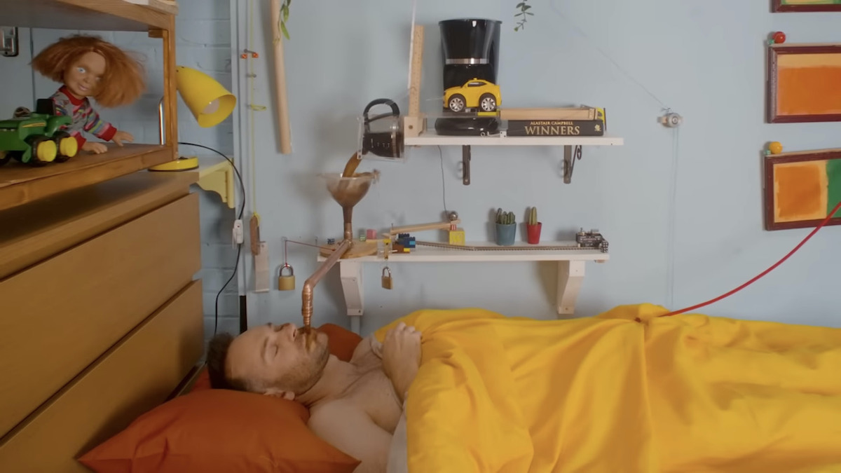 目覚まし時計が鳴り出すと、寝室に張り巡らされた仕掛けが発動。ピタゴラ装置のように身近な物で作られたギミックが連鎖していきます。