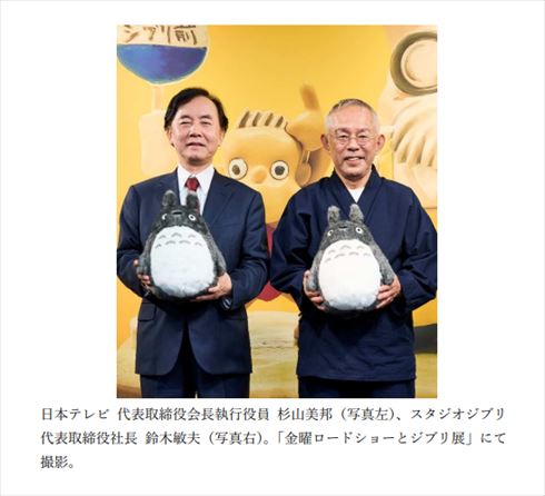子会社化後、スタジオジブリの代表取締役社長には日本テレビ役員の福田博之氏が就任。現社長の鈴木敏夫氏は代表取締役議長となり、宮崎(※崎は正しくはたつさき)駿氏は取締役名誉会長となります。