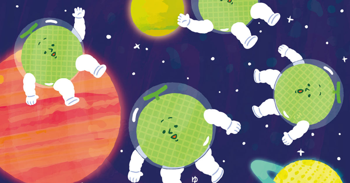 宇宙をただよう「メロン」の皆さん。あれれ、宇宙人さんコンニチワ! さてさて、このメロンだらけのイラストの中に「きゅうり」が隠されています。どこか分かりますか? 隠し絵クイズに挑戦してみてください。