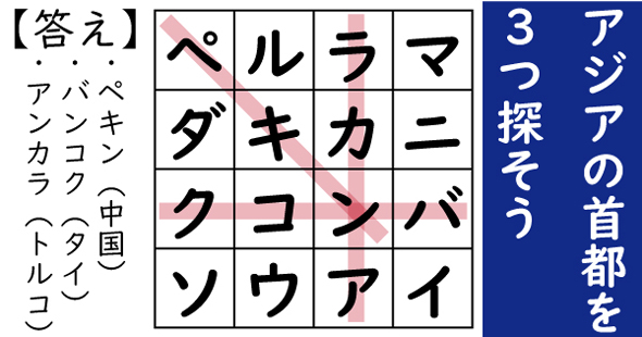 答え:ペキン(中国)、バンコク(タイ)、アンカラ(トルコ)