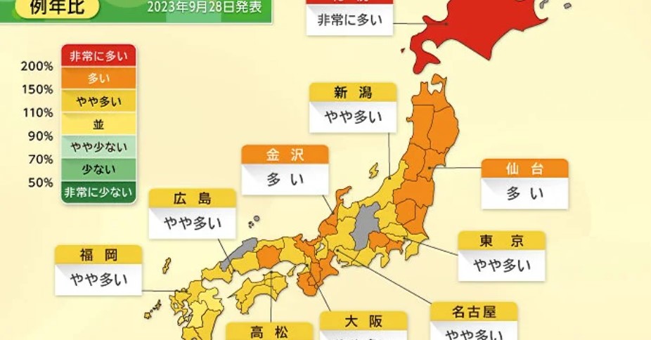 前シーズン比では、北陸は60%前後で少ない、九州・四国・中国・近畿・関東甲信は70〜80%程度でやや少ない、東海は90%前後で前シーズン並、北海道は600%以上で非常に多い見込みです。東北は地域によって差が大きく、東北南部は80%でやや少ない予想ですが、東北北部はおよそ300%で非常に多い予想となっています。