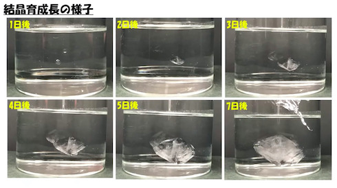 最初のうちはあまり大きさが変わらなかったそうなのですが、時間がたつにつれ結晶はどんどん成長。1週間後には、約3センチほどの大きくてきれいな結晶が完成しました。