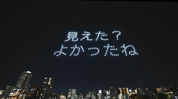 開始時刻の19時、夜空へ最初に浮かび上がったのは「10/10 目の愛護デーなので」「ロート 目の愛護ショー」という文字列。なるほど、目の愛護デーに合わせたロート製薬のイベントというわけですか。