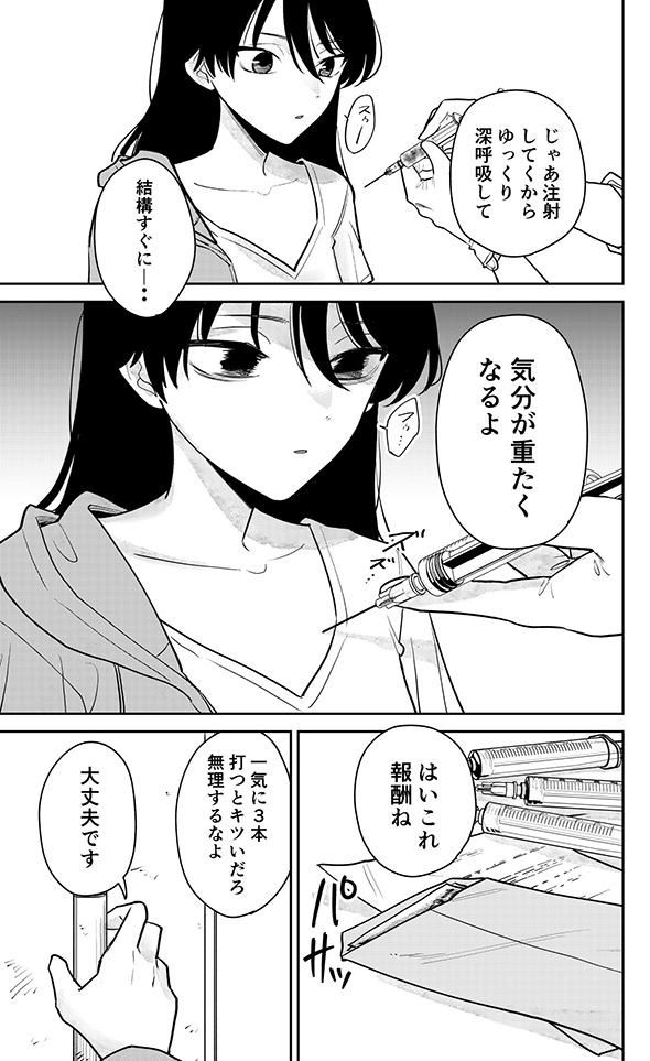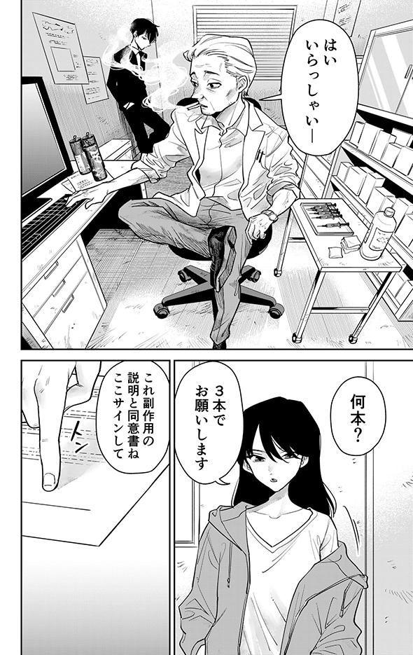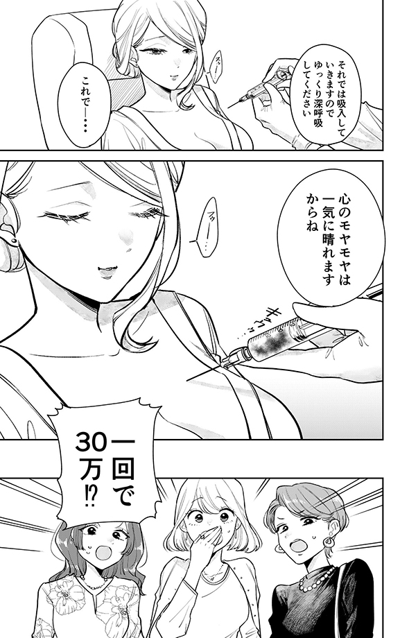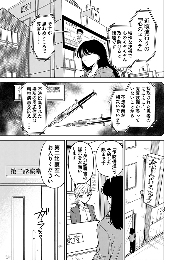 注射器を使って心のモヤモヤを吸い取ってくれる「心のエステ」が流行しているという設定。料金はかなり高額なのですが、「心のモヤモヤが30万円で取れるなら安いもの」と喜んでいる人もおり、評判は悪くない様子。ですが、そうして除去された心のモヤモヤは一体、どこにいくのかというと……。