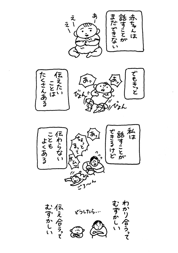 まだ言葉を話すことはできないけど、体を動かしたり「あー」「えー」と発したりして何かを伝えようとしている赤ちゃん。大人同士のように会話することができず、自分の気持ちを「伝え合うってむずかしい」と親は悩んでしまうこともあります。