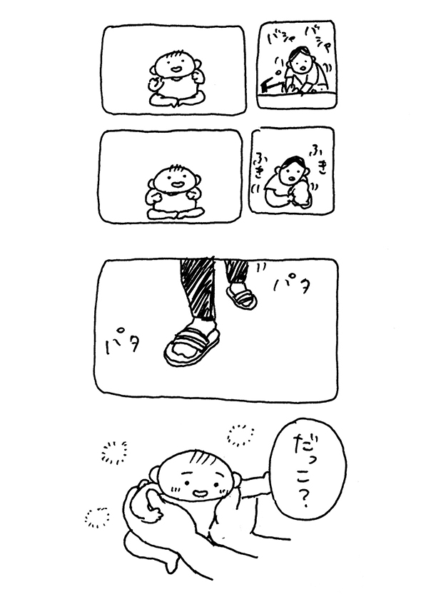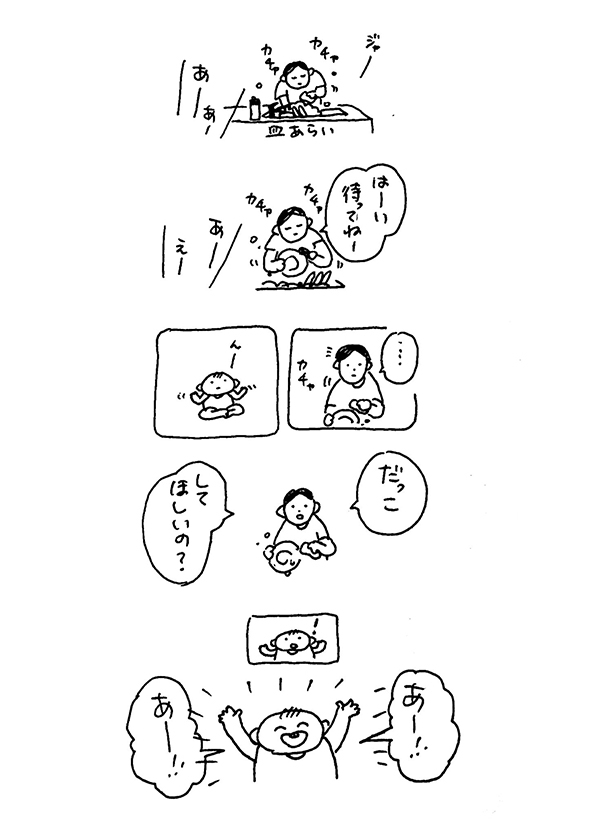 ある日、お皿洗いをしていると、赤ちゃんは「あーあー」「あーえー」と、言葉にならない言葉で何かを伝えようとしている様子。「だっこしてほしいの?」と聞いてみると、赤ちゃんは「あー! あー!」とうれしそうな姿を見せてくれます。