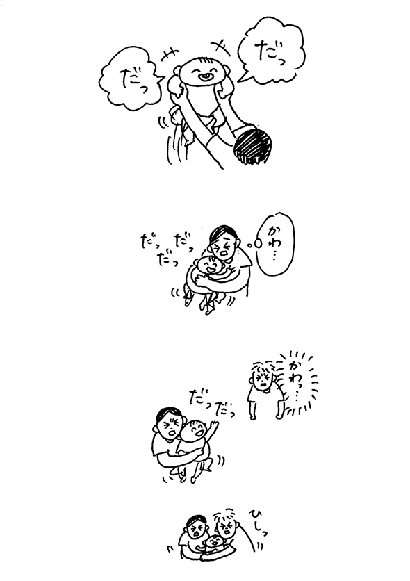 ササッと家事を片付けてだっこしてあげると、赤ちゃんは足をバタつかせて喜んでくれ、あまりのかわいさに思わず親子3人で抱きしめ合うのでした。