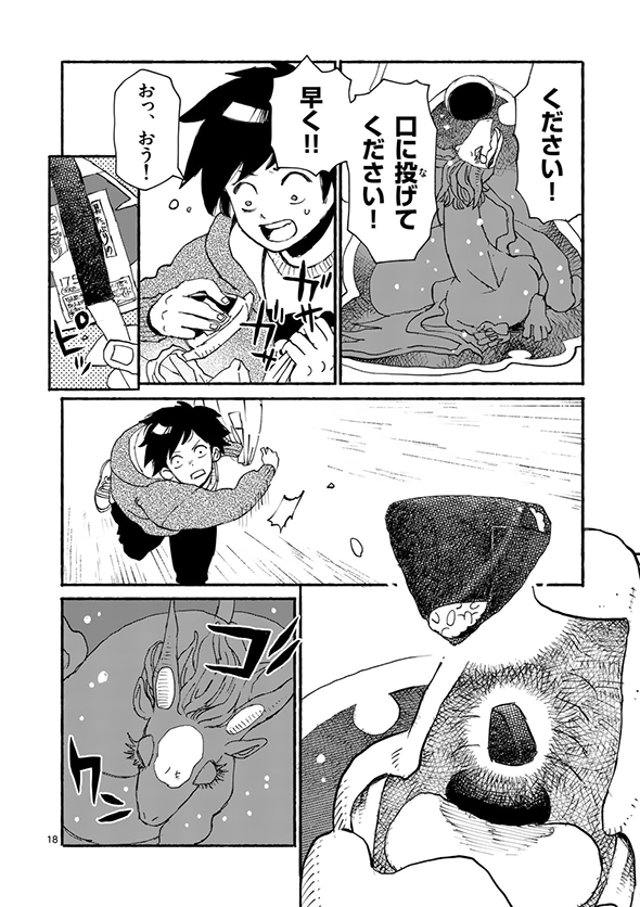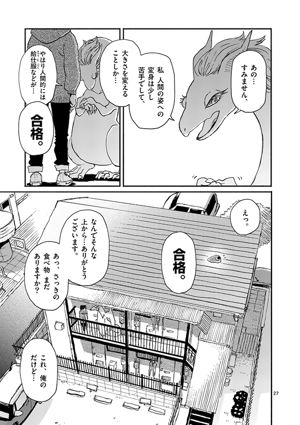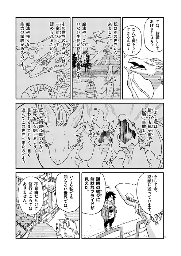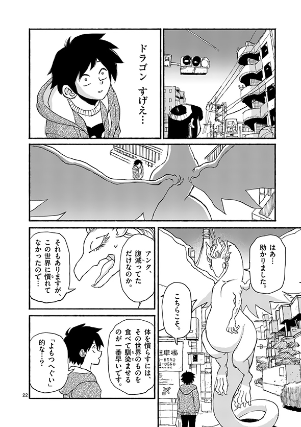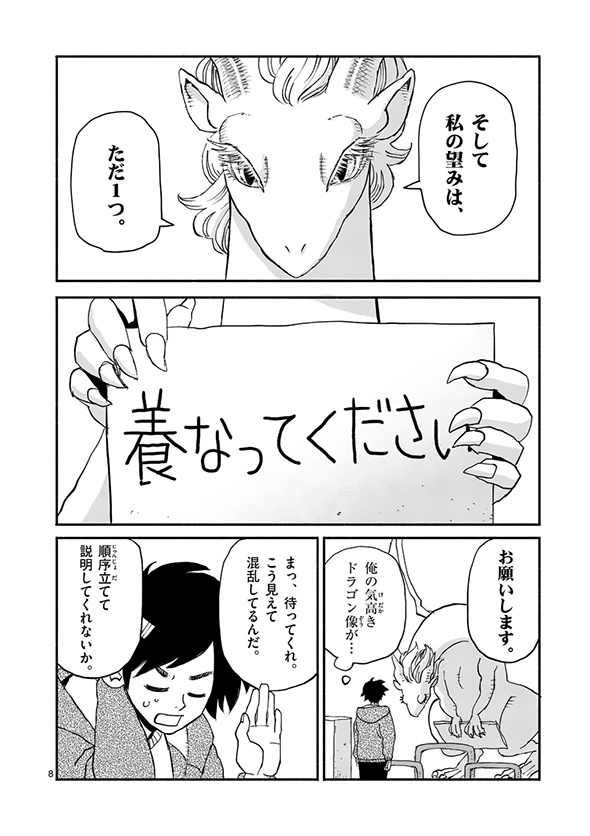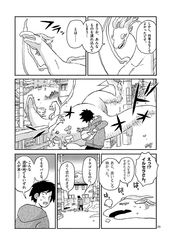ある日、大学生の村上がふらっと出掛けたら、公園に凛とした顔つきで「養なってください」(送り仮名がちょっとおかしい)というメッセージを掲げた巨大なドラゴンの姿が。話を聞いてみると、名前をイルセラといい、もともとは別の世界で暮らしていたものの、“一竜前”として認められるための試験に失敗してしまい、修行のためにこの世界にやってきたのだそうです。