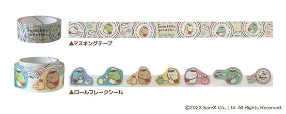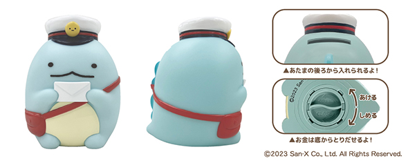 配達員風風の衣装をまとった“すみっコ”たちがかわいらしい「貯金箱(とかげ)」「刺繍缶バッジ(6種)」「コーデュロイトート」「シェルポーチ」「マスキングテープセット」「5インデックスフォルダー」の全6アイテム。「郵便局のネットショップ」に加え、全国の一部郵便局で販売されます。