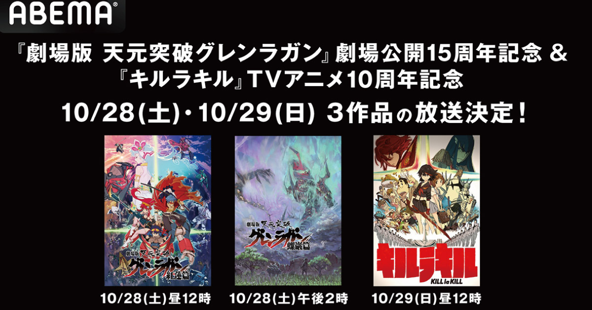 今回のABEMAでの放送は、『劇場版 天元突破グレンラガン』劇場公開15周年、『キルラキル』TVアニメ10周年を記念したもの。10月28日正午から『劇場版 天元突破グレンラガン 紅蓮篇・螺巌篇』、29日正午から『キルラキル』全24話が一挙放送され、1週間にわたって無料で視聴できます。