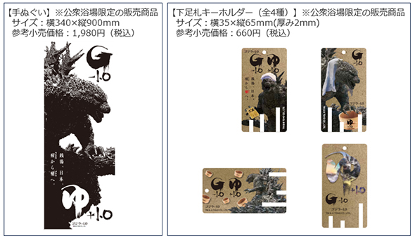 合わせて、オリジナルグッズとして「手ぬぐい」「下足札キーホルダー」の販売も。銭湯にちなんだデザインが多く、ゴジラが頭にタオルを載せたり、桶を持ったりしている姿が怪獣なのにちょっとかわいい。
