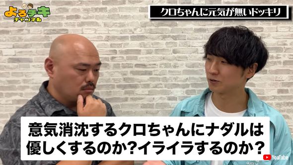 2人は先輩後輩の関係にあたり、10月からはタッグを組んだ新番組「クロナダル」(テレビ朝日系列)もスタート。クロちゃんはお互いの関係性の深さから、元気がない自分の姿を見たらナダルさんも「優しくなると思うよ」と予想しますが、果たして……。