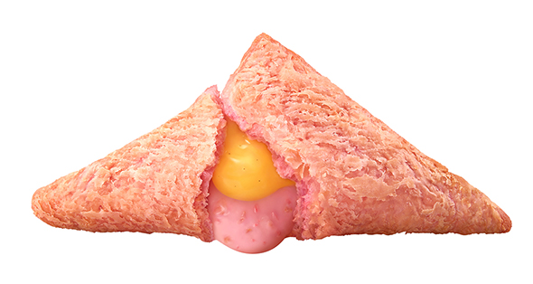 「三角チョコパイ」は2007年に登場し、定番化している秋冬向けのメニュー。今回登場する「いちごカスタード」は、甘酸っぱいストロベリーチョコクリームとカスタードクリームという2種類のクリームと、サクサク食感のパイ生地が味わえるスイーツになっているとのこと。