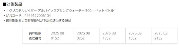 大塚食品が11月1日、「クリスタルガイザー500ミリペットボトル」の一部製品を自主回収すると発表しました。ペットボトル口部に不具合があり、キャップ部分の密封性が保たれていない可能性があるとのこと。