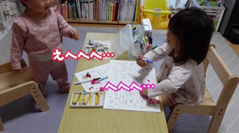 動画を公開したのは、YouTubeチャンネルの「いっちーファミリー」。3歳の長女・ここなちゃんがお絵かきをしていたところ、何を描いているか気になったのか、1歳の次女・かんなちゃんが興味ありげにのぞき込んできました。