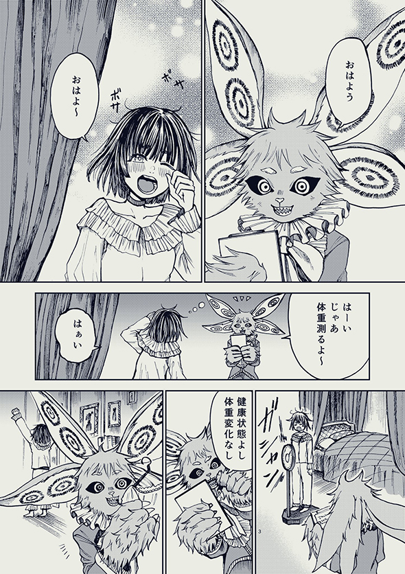 人類が絶滅危惧種になり、「キメラ族」によって屋敷の中で保護されているという世界観。人間の成長ぶりを見て楽しむ「お披露目会」も行われており、数少ない人間の少女・カレンは、生まれながらのアイドルのような扱いを受けています。